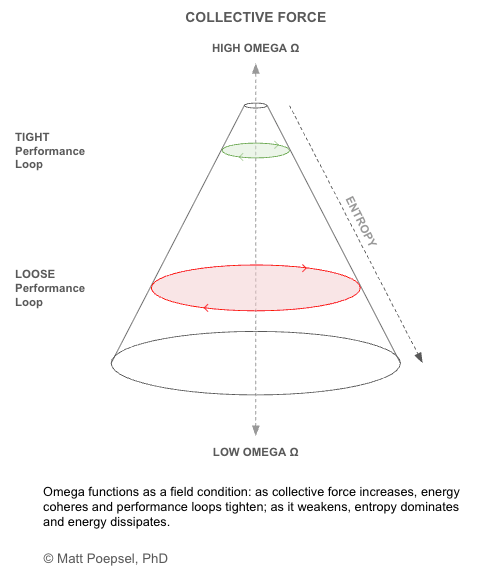 Consider group work as a “performance loop” cycle of collective thought, behavior, and emotion. The model below illustrates how collective force (Ω) shapes the tightness of performance loops and determines how energy is conserved or lost within a human system.